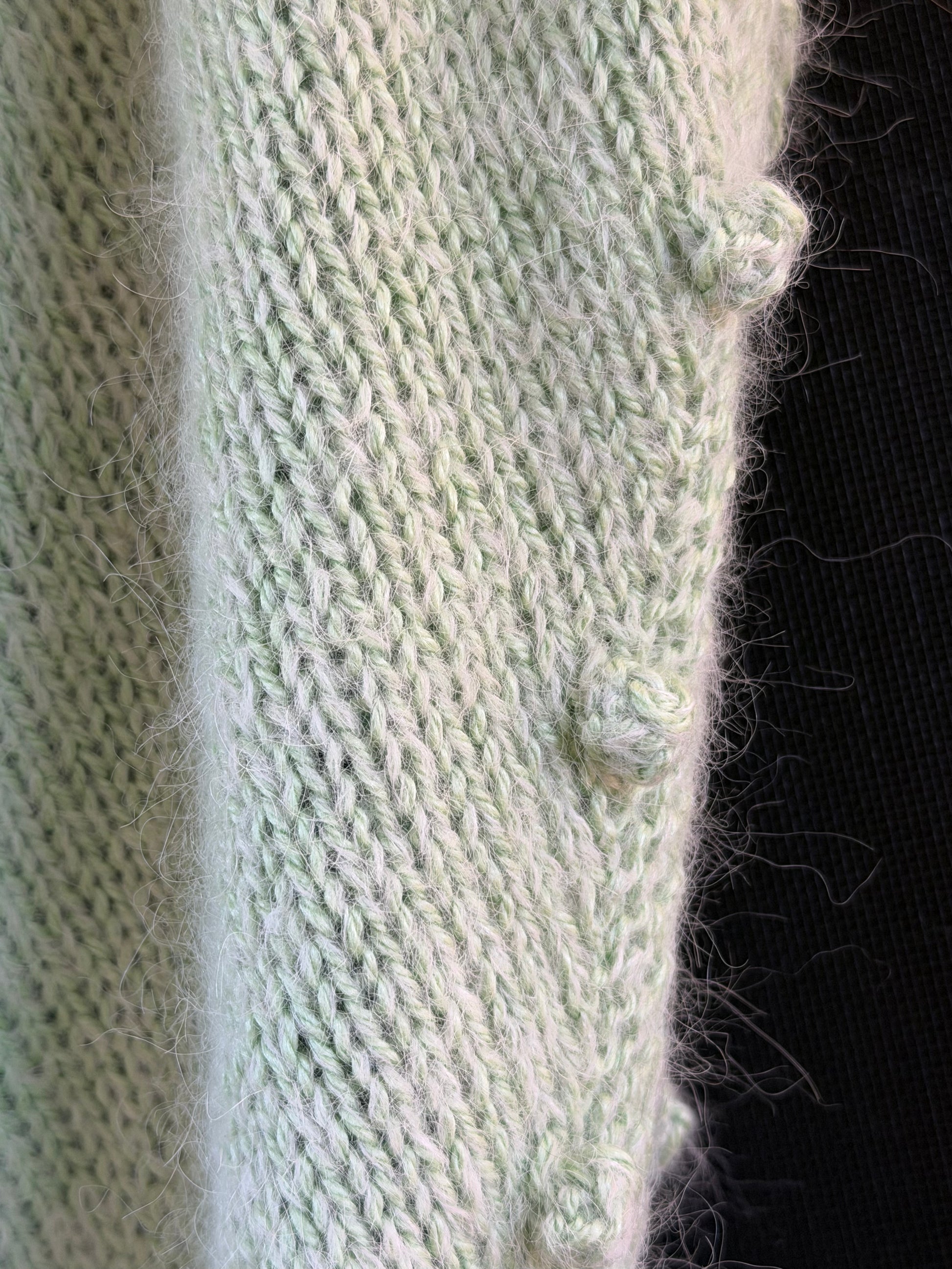 The Suri/silk blend was a lace yarn I’d picked up from Yarning-a yarn store in Albuquerque, NM. Had no idea what I intended to do with it at the time. The dyer is an Arizona Indie dyer- Hot Magenta Yarn Company. I found a mint silk/merino yarn-Delish by Jody Long to pair with it to create this lush, super soft piece.